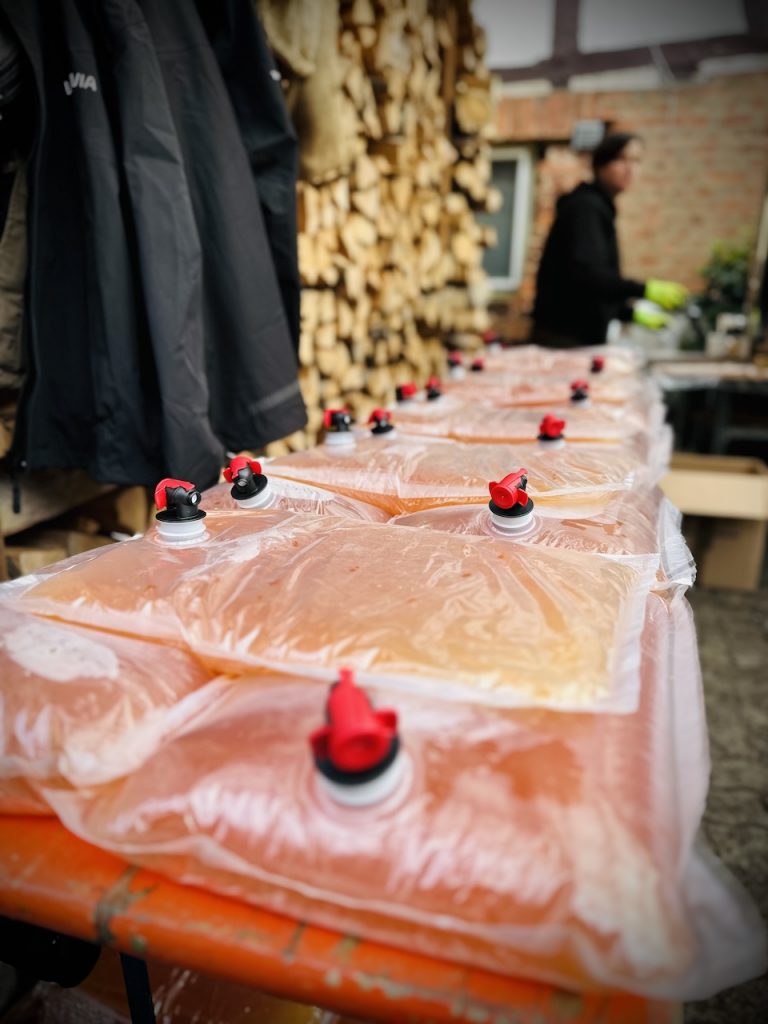 Ein weiterer Teil des Mosts darf jetzt noch ein wenig weitergären – und wird bald als leckerer Apfelwein in geselliger Runde oder auf Ronneburger Festen, z. B. dem Hüttengesäßer Weihnachtsmarkt, ausgeschenkt. Der Rest wurde eingekocht und als haltbarer Apfelsaft in sogenannte „Bag-in-Box“-Säcke abgefüllt.